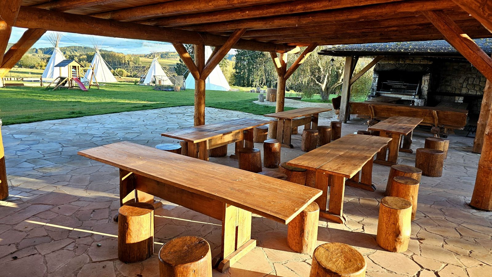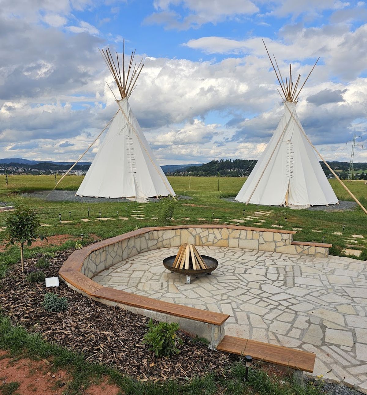 - 4× teepee – 3× 7 m (až 6 lůžek/teepee), 1× 9 m (až 10 lůžek). Každé teepee je vybavené elektřinou, osvětlením a topením, takže nabízí komfortní zázemí i v chladnějších měsících.