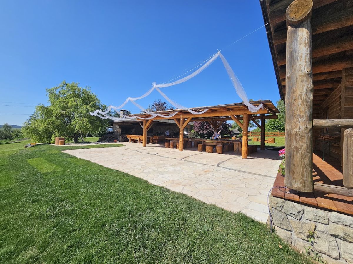 - Přístřešek:Posezení pro 30 hostů. Originální dřevěné stoly a špalky.